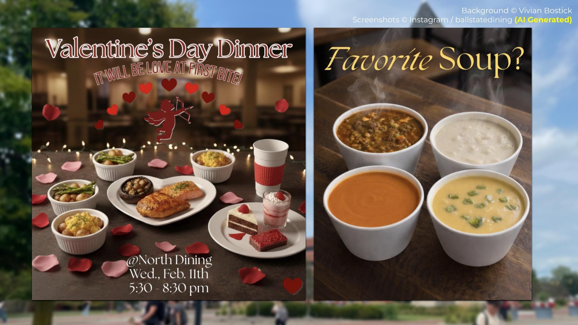 MUNCIE, Ind. - On February 4, Ball State Dining posted a promotion for its Valentine’s Day Dinner on their Instagram page. However, the use of AI-generated food was not “love at first bite” to some Ball State students.