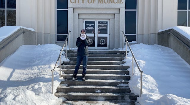 Outside Muncie City Hall, Bordenkecher said “I was given a year of conduct probation for standing in a lobby,” and “There is no First Amendment at Ball State.”